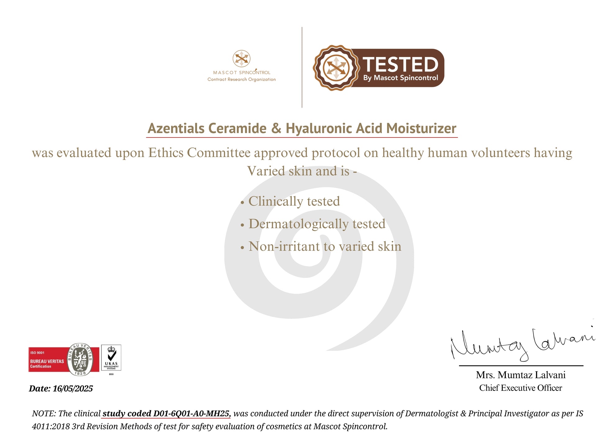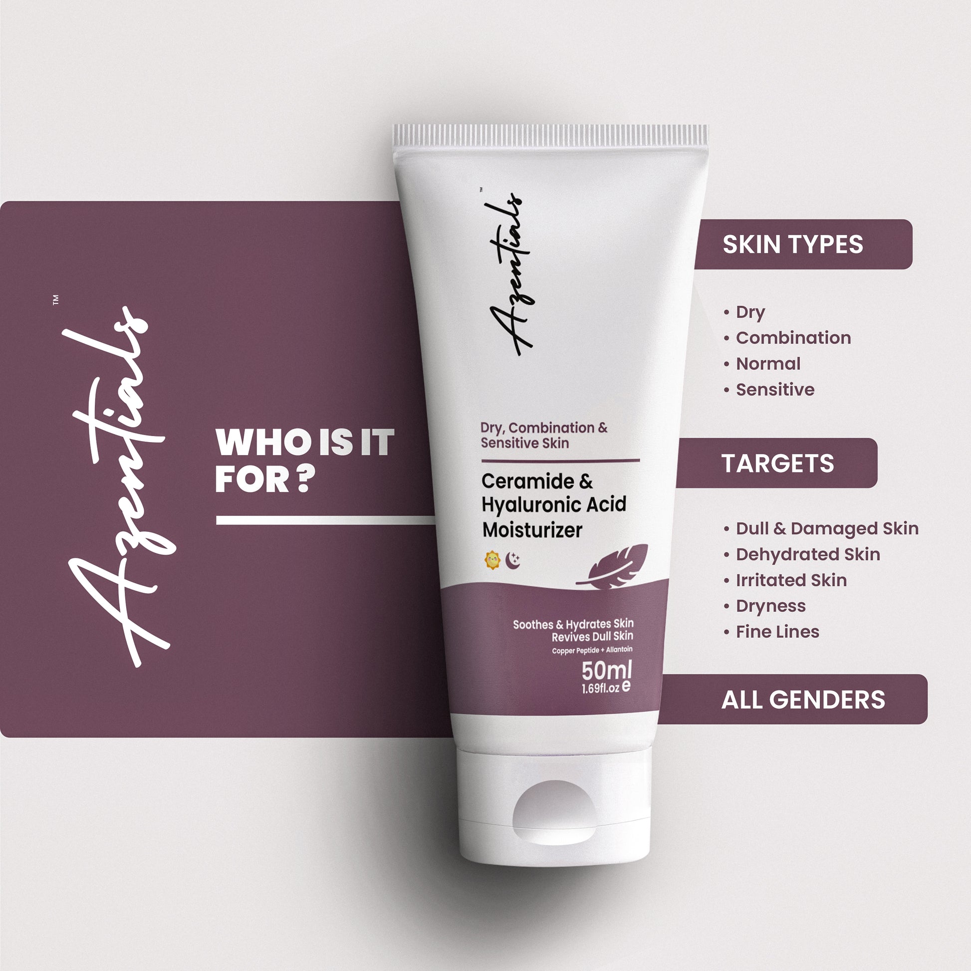 Give your skin the ultimate hydration and protection with Azentials Ceramide and Hyaluronic Acid Moisturizer. This lightweight, non-greasy formula is infused with Ceramide, Hyaluronic Acid, and Copper Peptide to restore your skin’s natural moisture balance and strengthen the skin barrier, leaving you with smooth, nourished, and glowing skin. Perfect for sensitive skin types.